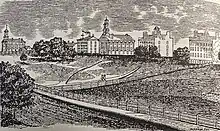 The institution's name comes from the area in which it was built, the Connecticut Western Reserve, as it was the first of its kind in Northern Ohio. The settlers from Connecticut wanted to build a school of the same caliber as Yale College. They selected the same architectural design, with brick buildings and the same motto, Lux et Veritas. People called it "the Yale of the West."[8] The first cohort included eleven students at the college level and eight at the preparatory level.[9] In 1882, the college section moved north to Cleveland and became Western Reserve University, later merging with the Case Institute of Technology to become Case Western Reserve University. Western Reserve Academy remained open for another twenty-one years until 1903, when it closed due to financial problems.