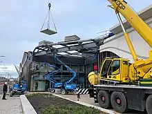 Both the existing shells and the new buildings are connected by a façade with a white concrete top inspired by voile fabric, transforming itself along the building. The façade has been made of ultra-high-performance concrete. The simpler curved concrete panels are cast in adaptable steel moulds. The more complexly curved concrete panels are cast in moulds milled from large blocks of MDF.[3]
