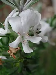 3mm (0.05-0.12 in) wide, emerging from white stems in whorls of four, with a silver-white abaxial surface and densely appressed hairs covering the leaves and stems.[3][2] Conspicuous, insect attracting flowers appear late Winter to Summer[3][4][5] with white to mauve petals and medium pink markings on the throat.[6] Influences are asymmetric and pedicellate, with solitary flowers emerging in the axils of new growth.[3] The corolla consists of five fused petals that are twice as long as the calyx and covered in sparse hairs. The lobes are narrow with two slightly wider petals at the top of the flower forming the upper lip and three narrower ones forming the lower lip. Calyxes are persistent and narrow-triangular with a tapered end, 5-6mm (0.20-0.24in) in length and over half as long as the tube.[3] The fruit consists of four, reticulate-rugose nutlets encased in a dry schizocarp, appearing after flowering, usually still encased by the calyx.[6][2] Reproductive parts consist of four stamens, with slightly pink-brown anthers, and a white pistil. The upper two stamens are fertile, while the lower two stamens are infertile, or staminode.[7]