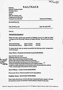 - ↑ "Picture Gallery: Weymouth Tramway to be put into permanent out-of-use status". Dorset Echo. 3 February 2016. Retrieved 22 April 2016.