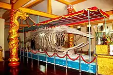 At the Van Thuy Tu relic temple in coastal town Phan Thiet, a 20-meter-long whale skeleton, Vietnam's largest, is on display. In the south-central province of Binh Thuan, Van Thuy Tu is located on Ngu Ong Street, Duc Thang Ward, about 150 meters from Phan Thiet Port. The relic draws a large number of interested tourists on weekends. According to legend, a massive whale beached itself here in the 18th century, after the temple was completed. It took two days to bring it to the temple, which had its front gate demolished in the process due to its size, which was over 20 meters long and weighed 65 tons, while awaiting a funeral ceremony. When the body had finally decomposed after three years, the ashes were retrieved, washed with water and good spirits, and then transferred to the temple's back to be worshipped and stored. Van Thuy Tu was classified as a national-level artistic activity in architecture by the Ministry of Culture and Information in 1996. In 2019, the Van Thuy Tu fish ceremony was declared a national intangible cultural heritage.[15]