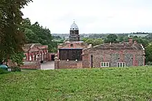 After Lord Charles Spencer completed the purchase of the manor in 1770, he seems to have had Wheatfield Park enlarged with the addition of a bow-fronted north wing.[2] By 1787 there was an ornamental lake in front of the house.[2] The house caught fire on New Year's Day 1814.[2] Fire engines from Shirburn and Watlington fought the blaze, but were hampered by a severe frost that had frozen much of the available water.[2] This was during the Napoleonic Wars, and French prisoners of war on parole from Thame came to help.[2] Their French officer helped to organise the villagers to fight the fire, but when he proposed that half of the house could be saved by blowing up the other half, Lord Charles Spencer refused stating that he feared for the safety of the crowds of people and of St. Andrew's church.[2] Wheatfield Park's stables, coach-house, farmhouse, an 18th-century barn and other farm outbuildings detached from the house escaped the fire.[2] The coach house, stables and farmhouse form three sides of a courtyard, with a wall enclosing the fourth.[3] They are now Grade II* listed buildings.[4]