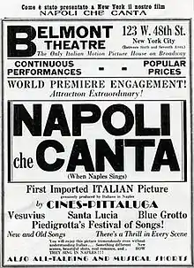 When Naples Sings (Italian: Napoli che canta) is a 1930 Italian musical film directed by Mario Almirante and starring Malcolm Tod. The film was originally made in 1928 as a silent film but delays, including the addition of sound, meant it was not released for two years. It consists almost entirely of recorded Neapolitan songs[1] It was shot at the FERT Studios in Turin. The film enjoyed some success, and was distributed in seven South American countries.[2] It has been described as a "poorly made musical film".[3]
