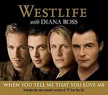 "When You Tell Me That You Love Me" is the second single released from Westlife's sixth studio album, Face to Face (2005). It features vocals from original artist Diana Ross. The single peaked at No. 2 on the UK Singles Chart, just losing out on the top spot by a mere 171 copies. The song was the 39th best selling single of 2005 in the UK. It debuted with 40,708 combined physical and download sales in the UK alone.[42] The single reached 120 000 copies sold in UK so far.[43] This single marked its fourteenth year since the original Diana Ross version was released and peaked at No. 2, the same chart position in the UK Singles Chart in 1991.
