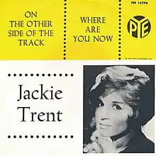 Trent recorded "Where Are You Now" shortly before travelling to South Africa for a three-month tour.[2] Speaking in 1965, the singer said she was "so used to having near-misses" that she had already started looking for a follow-up to the song after recording it.[8] The second series of It's Dark Outside was transmitted during Trent's absence from the UK, with "Where Are You Now" used diegetically in several episodes, played incessantly by the doomed female lead Claire (played by Veronica Strong).[2][9][10] Many viewers contacted shops and publications to inquire about the song,[2] prompting Pye to issue Trent's recording as a single backed with a version of "On the Other Side of the Tracks", written by Cy Coleman and Carolyn Leigh for the 1962 Neil Simon musical Little Me.[11] Trent performed the song on the 29 April 1965 edition of BBC1's Top of the Pops.[12] For one week in May 1965, the single made number one on the Record Retailer, Disc, NME and Melody Maker charts in the UK, knocking the Beatles' "Ticket to Ride" off the top spot on the latter two charts.[13] Trent was informed of the record making number one ahead of her performance at the London Palladium.[14] The song was later included on Trent's debut album The Magic of Jackie Trent (1965).[13]