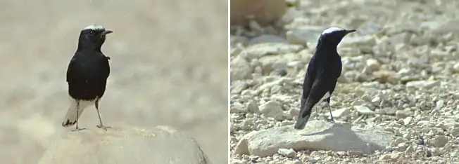 The similar black wheatear, Oenanthe leucura, also breeds in the western part of the white-crowned wheatear's range, but the latter has a black inverted T on its white tail, whereas white-crowned has only a black centre to its tail. The black wheatear never has a white crown.