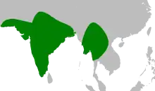 This species is widely distributed in South Asia, throughout India in the plains and extending up to 1000 m in the Himalayas. It is a resident in Iran, Pakistan, Nepal, Bangladesh, and Myanmar. A form that is possibly of this species has been recorded in the Greater Sundas, Indonesia but this population is widely disjunct and has whiter and unmarked feathers on the thigh or "trousers" and vent, possibly representing a new form.[9] It is absent from Sri Lanka and is probably absent from the Andamans. It is a summer visitor in northeastern Afghanistan. It is mainly found in the plains, but may go up to 1200 m altitude in the foothills of the Himalayas.[3]