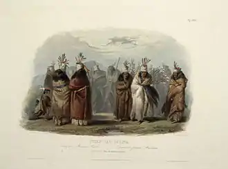 In ceremonies written about by men in the 1800s, they said members of the society have traditionally painted one eye a color based on their personal preference, typically blue, tattooed black marks between their lips and chin, and some women wore a headdress made of white buffalo cowhide embellished with feathers. At certain ceremonial dances, the leader is said to have worn a white buffalo cow hide blanket and danced while holding a bundle of twigs capped with eagle plumes.[1]