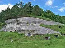 To the Croats are attributed two Gords of unusually big dimensions and each of them could inhabit tens of thousands of people – Plisnesk with a surface of 450 ha, including a fortress with a pagan center, surrounded by seven long and complex lines of protection, several smaller settlements in the near vicinity, more than 142 burial mounds with both cremation and inhumation partly belonging to warriors and else,[380][381][382] located near village Pidhirtsi and since 2015 regionally protected as a Historic and Cultural Reserve "Ancient Plisnesk";[383] and Stilsko with a surface of 250 ha, including a fortress of 15 ha, defensive line of 10 km,[384][385] located on river Kolodnitsa (used for navigation of ships as was connected to most important river in the region, Dniester[386][387]) between current village Stilsko and Lviv.[65][388] In the vicinity of Stilsko were also found some of the only examples of a pre-Christian period cult building among Slavs,[389][390] for one of which Korčinskij assumed a possible connection with the medieval descriptions of a temple dedicated to the deity Khors.[65][391] Until 2008 near Stilsko have been found more than 50 settlements of open type dated between 8th–10th century,[392] as well around 200 burial mounds.[393][387]