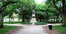 Along the center walkway in line with Church St. is The Defenders of Fort Moultrie, honoring South Carolinian soldiers during the Battle of Sullivan's Island. It is often called the Jasper Monument since it shows a statue of Sergeant William Jasper, a hero of the Revolutionary War battle won by the colonists at Fort Moultrie on Sullivan's Island on June 28, 1776. The memorial was added in 1877.[7]