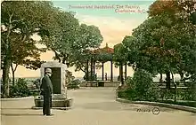 Located across from Meeting Street in the center of the park, a bandstand, begun in 1906 and completed in 1907, is a memorial to Mrs. George W. Williams by her daughter, Mrs. Martha W. Carrington. The bandstand, designed by William Martin Aiken and built by Robert McArtney,[17] cost more than $5,000 when it was built and hosted regular concerts. The new bandstand replaced a dilapidated wood structure.[18] The inaugural concert for the new bandstand was held on June 28, 1907 to celebrate Carolina Day with music by Metz's Military Band.[19]