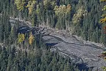The White River exhibits braided river and meander behavior with coarse woody debris deposited on extensive gravel bars. Populus trichocarpa, with its brilliant yellow fall foliage, grows alongside in the Abies amabilis forest.