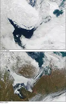 In winter, from October–November to May–June, the sea freezes, with the average January water temperatures of −1.9 °C in the north, between −1.3 and −1.7 °С in the centre, and between −0.5 and −0.7 °С in the bays. These variations are due to the distribution of water salinity across the sea, which increases from 24 to 26‰ in the centre to 30.5‰ in the gorlo, reaching 34.0–34.5‰ toward the Barents Sea. The freezing period varies from year to year as shown in the satellite image to the right.[1] The ice is not stationary, but 90% of it is floating and is continuously removed to the Barents Sea. Ice thickness is usually about 40 cm but may reach 150 cm in cold winters.[3]