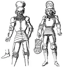 Suits of white armour were composed of a helmet, a gorget (or bevor), pauldrons with gardbraces in Italian and French armour to cover the armpits, or besagews (also known as rondels) which were mostly used in Gothic Armour, couters, vambraces, gauntlets, a cuirass (back and breastplate) with a fauld, tassets and a culet, a mail skirt, cuisses, poleyns, greaves, and sabatons.