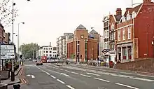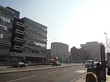 In the 1960s the street became one-way as part of the Aldgate Gyratory, isolating the buildings on the south side as far as Gardiner's department store in the centre of a large roundabout with return flow along Braham Street. Large concrete and glass office buildings occupied this area, creating a "sense of desolation and insecurity for pedestrians".[2] The gyratory system was removed in 2008, and Whitechapel High Street became two-way again. Tall office and apartment buildings were combined with attempts to improve the street level environment.