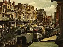 "Whitechapel High Street was lined with coaching inns; the road was full of traffic, carts with garden produce, market women with baskets of fruit, flocks of sheet, herds of cattle, brewers' drays and hay wains for the hay market."[14] From at least 1665 until 1928, in the Whitechapel hay market, farmers sold animal fodder from large carts in the street.[15]