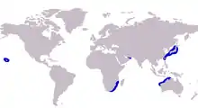 The whitefin trevally is distributed throughout the tropical and temperate waters of the Indo-Pacific region, although in a very patchily recorded distribution.[2] In the western Indian Ocean, the species has only been recorded from South Africa, Somalia, and in the Gulf of Oman. In the eastern Indian Ocean, the species is known from northwestern Australia, and definitely extends its distribution into the Pacific as far as Okinawa.[2] If Carangoides dasson is synonymous with Carangoides equula, this extends the species distribution well into the Pacific, ranging to Hawaii and Easter Island. Before the species was recorded in Australia in 1988, the whitefin trevally was thought to only have an antitropical distribution.[7] The fish probably has a more continuous distribution than currently known, with lack of adequate sampling contributing its patchily known distribution.