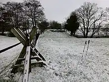 The route of the branch commenced on the north side of the level crossing in Grimsargh and curved sharply westward on a falling gradient into the deep cutting and on to the embankment before crossing Brabiner Lane.[8] The line then climbed on a gradient of 1:120 to the hospital grounds passing over a small accommodation bridge before entering Whittingham station.[7] A small coal storage area and engine shed existed beyond the hospital station[9] and the 1921 extension continued for 523 yards (478 m) across the hospital lawns, beside the fish pond, to the boiler house.[10]