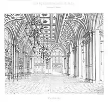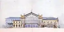Stuttgart professor of architecture Wilhelm Sophonias Bäumer was commissioned by the Northwest Railway Construction Department to build the passenger station, after he had been invited to submit a draft in 1869.[14] The specification was a station with five tracks, which can be extended if required. It was not yet clear how the northwest railway would develop. Construction of the hall began in January 1870,[15] with Bäumer being supported in the construction phase until 1873 by Theodor Reuter as site manager, who at that time was chief engineer in the central office for building construction of the Northwest Railway.[16] Bäumer, who moved his residence to Vienna for the project, also developed large residential buildings in the vicinity (Heinestraße 41 / Praterstern 1 / Kleine Stadtgutgasse 12 and 14) as well as some villas in the surrounding area of Vienna and Carinthia during the construction supervision for the construction of the railway station.[17]