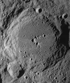 Within the crater, much of the interior floor is relatively level, with a clump of small ridges forming a central peak structure near the midpoint. There is a small craterlet to the east-northeast of these ridges, and there are several small craterlets near the southwestern inner wall.