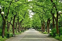In 1938, in Wierzbno was opened the Dreszer Park, an urban park designed by Zygmunt Hellwig in the modernist style, and located between current Ursynowska Street, Independence Avenue, Odyńca Street, and Krasickiego Street..[20][21] In 1944, during the Second World War, the park become a defensive point of the Polish resistance fighters of the Warsaw Uprising, mainly from the Baszta Regiment Group, who defended their position from German forces attacking from the north between 2 and 13 August 1944, and from the south, between 25 and 27 September 1944.[22][51] During the war the park was used as a provisional cemetery, both for the fallen Polish resistance fighters and the civilian casualties.[21] After the end of the conflict, the bodies were exhumated and relocated to the proper cemmentaries. The park was restored and reopened in 1951.[51] The western portion of the park, located between Ursynowska Street, Odyńca Street, Krasickiego Street, and Independence Avenue, was separated from the rest, forming the Second Jordan Garden, one of the Jordan gardens in the city, which form urban green spaces dedicated as the recreational and play area for children and youth.[52]