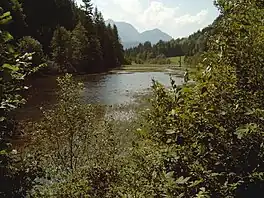 Wiesensee is fed from the south and drained to the north by the Katzelbach stream.[3] It is close to the source of the Katzelbach and 1.7 kilometres (1.1 mi) from the valley watershed separating that stream from the Dunkelbach river, however both ultimately progress to the Inn river and then to the Danube. The lake is gradually silting up and the southern end has become a reed bed.