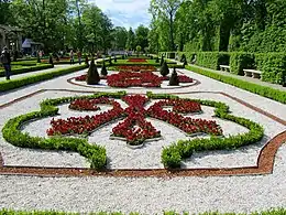 An integral part of the palace, almost since its beginning, is the garden. Initially, it had the character of a baroque Italian garden in a semicircular form surrounding the palace on the east. In its composition this geometric garden fitted in well with the ancient patterns and the palace arrangement. It consisted of an upper garden located on a terrace with two arbours in the form of lanterns in each corner, and lower garden. During the third stage of the reconstruction of the palace the geometric garden parterres were replaced with embroidered parterres à la française inspired by André Le Nôtre's treaties.[31] At that time the garden was embellished with gilded lead sculptures by Gaspar Richter of Gdańsk and vases carved in cherry marble from Chęciny.[32] In the beginning of the 18th century the garden was enlarged, the late baroque parterre ornamentation was replaced with régence motives completed with Sieniawska's coat of arms Szreniawa in the northern parts and her monogram in the southern part.[28] In 1784 Izabela Lubomirska transformed neighbouring territories of Wilanów folwark into a jardin anglo-chinois according to Szymon Bogumił Zug's design. This new garden with rich vegetation, sinuous paths and cascades was inspired by works of William Chambers, Thomas Whately and August Moszyński.[33]