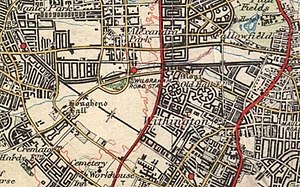 Alexandra Park station opened on 2 May 1892.[1] From 1 August 1897 to 1 January 1923 the station was owned by the Great Central Railway (GCR). The GCR was absorbed by the London and North Eastern Railway (LNER) during the Grouping of 1923.[4] The station was renamed Wilbraham Road on 1 July 1923 to avoid possible confusion with the north London suburb of Alexandra Park on the same network.[2] The naming was an unusual choice, since the station was about a 1⁄4 mile (400 m) from the A6010 Wilbraham Road, and was not visible from there.