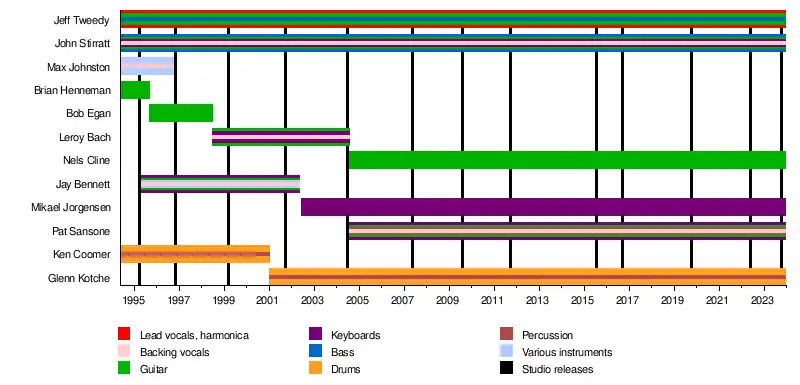 Wilco is an American alternative rock band based in Chicago, Illinois. The band was formed in 1994 by the remaining members of alternative country group Uncle Tupelo following singer Jay Farrar's departure. Wilco's lineup changed frequently during its first decade, with only singer Jeff Tweedy and bassist John Stirratt remaining from the original incarnation. Since early 2004, the lineup has been unchanged, consisting of Tweedy, Stirratt, guitarist Nels Cline, multi-instrumentalist Pat Sansone, keyboard player Mikael Jorgensen, and drummer Glenn Kotche. Wilco has released thirteen studio albums, a live double album, and four collaborations: three with Billy Bragg and one with the Minus 5.