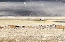 Many species of finches, robins, redstarts (like the black redstart) and the hoopoe are common in summer. The brown-headed gull is seen in summer on the river Indus, and on some lakes of the Changthang. Resident water-birds include the brahminy duck also known as the ruddy sheldrake, and the bar-headed goose (Ladakhi: Ladakhi: ngangpa). The black-necked crane (trhung-trhung) is a rare species found scattered in the Tibetan Plateau, and is also found nesting in summer in parts of Ladakh. Other birds include the raven, red-billed chough (chungka), Tibetan snowcock and chukar (a partridge, srakpa).[2] The lammergeier and the golden eagle are common raptors here. Marshes of Ladakh is a good breeding ground for many migratory birds.