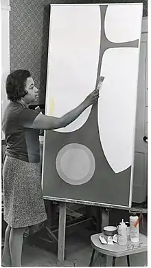 Wilhelmina Godfrey with her work Composition I, c. 1969; Image courtesy of the Burchfield Penney Art Center Archives