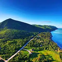 Wilkie Sugar Loaf is a forested pyramidal peak rising from the shore of Aspy Bay, 10 kilometres (6.2 mi) north of the Cabot Trail. There are few stand-alone mountaintops in Nova Scotia, but one of these is Wilkie Sugar Loaf, climbing to more than 400 metres/yards above sea level in less than 1.5 kilometers (0.9 mi). This peak belongs to the North Mountain range of hills bordering the Aspy Fault, but has been separated from the rest of the ridge by the deep ravines cut by Wilkie Brook and Polly Brook.[6]