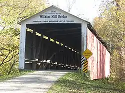 The Wilkins Mill Covered Bridge is north of Rockville, Indiana, United States. The single span Burr Arch Truss covered bridge structure was built by William Hendricks in 1906. The bridge is 120 feet (37 m) long, 16 feet (4.9 m) wide, and 13 feet (4.0 m) high.[4][5]