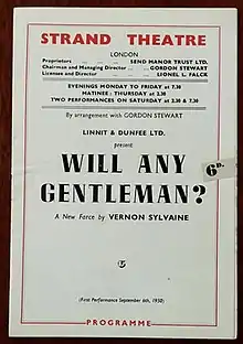 Will Any Gentleman? is a 1950 stage farce by the British writer Vernon Sylvaine.[1] The play was first performed at the Royal Court Theatre in Liverpool in July 1950. It then went on to the West End, running for 364 performances at the Stand Theatre between September 1950 and July 1951.[2] It starred Robertson Hare, who appeared in several plays by Sylvaine. Hare plays a mild-mannered bank clerk who, after a night out, is hypnotized into a much more assertive lifestyle.