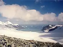 A view from Willan Nunatak towards Huntress Glacier and False Bay, with Deception Island in the background.