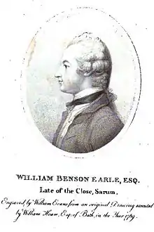 Earle was the eldest son of Harry Benson Earle. He was born at Shaftesbury, Wiltshire, in 1740, but his life was passed at Salisbury, with the history and charities of which city his name is inseparably associated. After spending his boyhood, first at Salisbury Cathedral School in the Close, and then as a commoner at Winchester College, he went on to Merton College, Oxford, where he graduated B.A. in 1761, M.A. in 1764. He then made the grand tour of the continent (1765–1767). In 1773 he was elected a fellow of the Royal Society.[1]