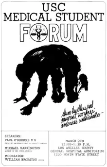 After graduating from UCLA, Bronston attended the USC School of Medicine.[10] In his first year, Bronston completed a fellowship in pediatrics at the Child Therapy Clinic at the Children's Hospital Los Angeles under Richard Koch, a professor of pediatrics at USC.[11] In September 1964, when Bronston was a senior, he helped organize the USC Medical Student Forum with sophomore Michael McGarvey and advice from former members of the Association of Internes and Medical Students (AIMS).[12] The USC Medical Student Forum was a series of lecture forums featuring a number of influential figures covering a variety of topics in medicine.[12] These included a forum on the legalization of abortion featuring Planned Parenthood president Alan Guttmacher, a forum on the health effects of Jim Crow laws featuring civil rights activist H. Jack Geiger and others featuring Michael Harrington, Thomas Szasz and Benjamin Spock.[13]