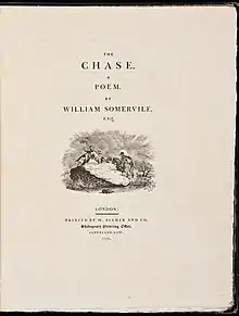 In 1796 Bulmer published a quarto edition of Somerville's "Chase". All the engravings but one in this volume were designed by John Bewick, and engraved by his brother Thomas Bewick. Other books followed, including Thomas Frognall Dibdin's Typographical Antiquities of Great Britain, Bibliographical Decameron, and the Bibliotheca Spenceriana.[2]