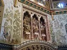 Burges inspired considerable loyalty within his team of assistants, and his partnerships were long-lived.[58] John Starling Chapple was the office manager, joining Burges's practice in 1859.[59] It was Chapple, designer of most of the furniture for Castell Coch, who completed its restoration after Burges's death.[60] Second to Chapple was William Frame,[59] who acted as clerk of works. Horatio Walter Lonsdale was Burges's chief artist,[61] contributing extensive murals for both Castell Coch and Cardiff Castle. His main sculptor was Thomas Nicholls who started with Burges at Cork, completing hundreds of figures for Saint Fin Barre's Cathedral, worked with him on his two major churches in Yorkshire, and undertook all of the original carving for the Animal Wall at Cardiff.[62]