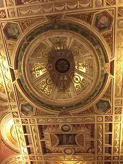 The interior was to have been a riot of Burgesian excess but not a single room was completed to Burges's designs.[140] Of the few interior features that were fully executed, much was altered or diluted by Heathcoat-Amory and his successors.[138] However some of the interiors, such as the library, vaulted hall and the arched red drawing room, remain[141] or have been re-instated.[138]