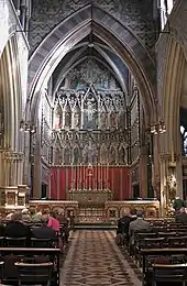 Butterfield's church of All Saints, Margaret Street, London, was, in the view of Henry-Russell Hitchcock, the building that initiated the High Victorian Gothic era. It was designed in 1850, completed externally by 1853 and consecrated in 1859.[1] Flanked by a clergy house and school, it was intended as a "model" church by its sponsors, the Ecclesiological Society. The church was built of red-brick, a material long out of use in London, patterned with bands of black brick, the first use of polychrome brick in the city, with bands of stone on the spire. The interior was even more richly decorated, with marble and tile marquetry.[1]