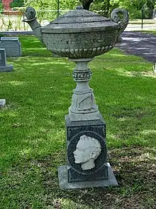 On April 1, 1898, Brann was walking alone on Waco's Fourth Street when he was shot in the back by Tom Davis, a Baylor supporter whose daughter was a student at the University.[1][4] After being shot, Brann turned, drew his pistol, and fired multiple shots at Davis, who fell, mortally wounded, in the doorway of the Jake French Cigar Store. Brann was shot through the left lung with the bullet exiting his chest. He was forced to walk to the city jail but later escorted home by friends.[8] Both Davis and Brann died the next day.[1][4] Brann is buried in Oakwood Cemetery, Waco.[1] Engraved on Brann's monument is the word "TRUTH," and beneath it is a profile of Brann with a bullet hole in it.[1][5] Brann remains a controversial figure to this day.[4]