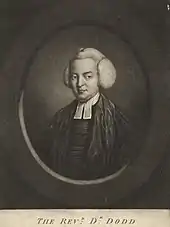 William Dodd (29 May 1729 – 27 June 1777) was an English Anglican clergyman and a man of letters.[1] He lived extravagantly, and was nicknamed the "Macaroni Parson". He dabbled in forgery in an effort to clear his debts, and was caught and convicted. Despite a public campaign for a Royal pardon, in which he received the assistance of Samuel Johnson, he was hanged at Tyburn for forgery.