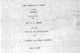 14 August 1968, Nkomo was invited to speak at the University of Cape Town's Day of Affirmation of Academic and Human Freedom.[11] His address, The Courage to Think[12] followed in a series after that of Robert Kennedy's Ripple of Hope speech in June 1966. In his speech he said, "The idea of a common patriotism and nationalism was always recognised by all. It was only in recent times with the emergence of apartheid theoreticians that the country definitely deviated from the path of a common nationalism."