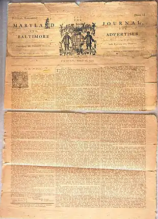 Goddard's Philadelphia business was floundering, so he decided to start over again. He bought the printing equipment and type from the widow of Nicholas Hasselbach, Baltimore's first printer, who had unexpectedly died a few years before.[20][lower-alpha 4] He then established Baltimore's first newspapers the Maryland Journal and Baltimore Advertiser, with the first issue on August 20, 1773.[38] The newspapers were printed with the type obtained from Hasselbach.[37] He informed his readers that he would publish all kinds of material of intelligence, foreign or domestic, that would be of interest to the Publick, like notices of the departure of ships, current prices of goods, the course of exchange, accidents, deaths, and events of every kind.[20] Goddard wanted to devote more time to the development of the colonial postal system, so he turned over the management of the Journal to his sister.[20] It was published under her name Mary Katherine Goddard, starting on May 10, 1775.[6][20] It later became a semi-weekly on March 14, 1783. Goddard would again take over the publication of the newspaper on January 2, 1784.[6]