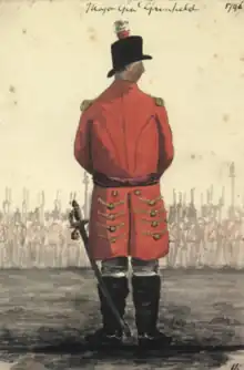 - ↑ In this period officers of the Foot Guards held two ranks. Buying a commission in these regiments cost more than it would have in other regiments, and so if an officer in the Foot Guards transferred in his rank to a different regiment he would lose money. To counter this Foot Guards officers held both a regimental rank and an army rank; if they transferred to a regiment outside of the Foot Guards then they would hold their higher, army, rank and would therefore not lose money.[6]