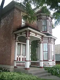 The Queen Anne elements on the house, influenced by the Eastlake principles, include: the ornamental iron fences, geometric squares and scrollwork, the etched and frosted glass on the main entrance, incised flowers on the porch and bay windows and the spindles lining the porch rails. In particular the ornamental iron fence work shows Eastlake influence in its medieval design.[2]