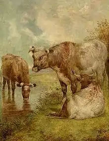 William Huggins was born in Liverpool. His parents were called Samuel and Elizabeth. He received his first instruction in drawing at the Liverpool Mechanics' Institution. He won a prize for "Adam's Vision of the Death of Abel" and successfully entered work to be shown at the Liverpool Academy of Arts whilst fifteen years old.[1] He drew from life using the classes at the Academy of Arts or by sketching the animals in Liverpool's zoo.[1] He travelled further afield to see exotic animals at the unusual Wombwell’s Travelling Menagerie.[5] His animal work was admired and compared to Stubbs. Huggins was magnanimous in acknowledging Stubbs' influence and this contrasts with a later comparison that was made with Landseer where Huggins felt insulted. Huggins pictures of exotic animals were much admired but they are noted for lack of background as Huggins never saw them in their own habitat.[6]