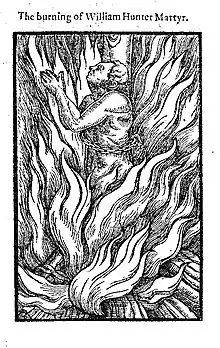 William Hunter was a Marian martyr burnt to death in Brentwood, England at the age of 19 on 26 March 1555,[1] on Ingrave Road. He had lost his job in London as a silk-weaver because he refused to attend the Catholic mass, despite an order that everyone in the City of London had to attend,[1] and had come to live with his parents in Brentwood, but got into a dispute when discovered reading the Bible for himself in Brentwood Chapel. He refused to accept the Catholic dogma of transubstantiation according to which the bread and wine of the communion become the body and blood of Jesus.[2]