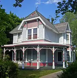 The house is a frame two-story three-bay home with a cross-gabled roof that comes to a jerkin shape in the front (west) side. A porch wraps around the first story to the south elevation. The south bay on the front side is projecting, with Stick-style decoration between the second-story window and roofline. On the south side is another projecting two-story bay with similarly tall bay window. The north profile features a round-arched stained glass window that illuminates a staircase.[1]